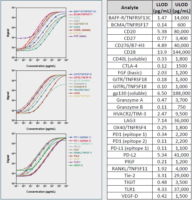 Calibrator curves, lower limit of detection (LLOD), and upper limit of detection (ULOD), for 27 human immuno-oncology assays are shown below. LLODs were calculated from 3 runs each with >20 blank wells. Control samples for each assay showed expected precision and accuracy, with intra-run CVs less than 10%, inter-run CVs less than 25%, and recoveries largely within 70-130% of target concentrations (data not shown).
