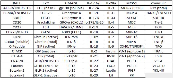 Other assays in the U-PLEX product line were tested for compatibility with the new immuno-oncology assays using performance criteria such as dynamic range, sensitivity, sample detection, and non-specific binding between assays of <2%.  84 existing human U-PLEX assays were found to be compatible, creating a human U-PLEX immuno-oncology group with 111 biomarkers (see the table below) that can be used together in multiplexed panels.