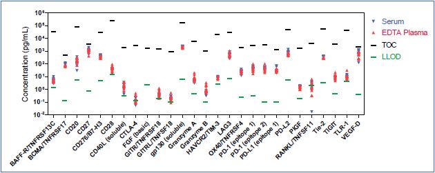 Immuno-oncology assays were evaluated for the ability to detect their respective analytes in human serum and EDTA plasma samples. Sample concentrations (pg/mL) were plotted with the top of curve (TOC) and LLOD for each analyte. Samples were diluted 4-fold except for BCMA/TNFRSF17, gp130 (soluble), HVACR2/TIM-3 and Tie-2 assays where samples were diluted 100-fold. FGF (basic) was not detected in human serum and plasma samples. All other analytes were detected irrespective of the type of matrix.