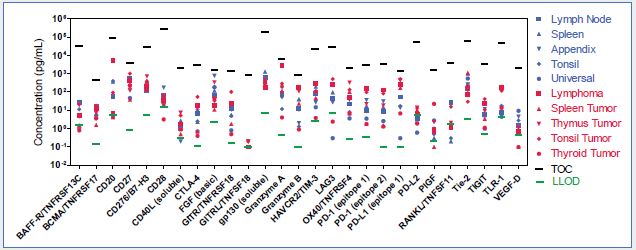 Human tissue lysate samples (5 µg) derived from different normal tissues (blue symbols) and tumor tissues (red symbols) were tested. Sample concentrations (pg/mL) were plotted with TOC and LLOD values for each analyte. All analytes were detected in most or all of the different tissue lysate samples.