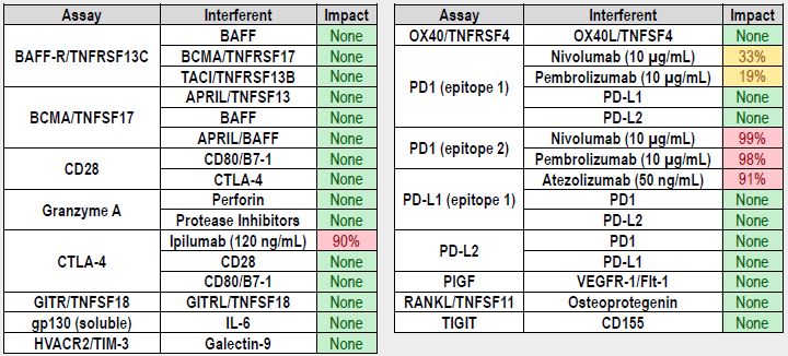 Human immuno-oncology assays were evaluated for interference and competition with homologous and/or related analytes. In addition, the CTLA-4, PD1 and PD-L1 assays were tested for sensitivity to specific therapeutic antibody drugs. Assay interference was evaluated by comparing the recovery of a single mid-range analyte concentration in the presence of a wide range of concentrations of the potential interferent. Competition was evaluated by comparing human serum and EDTA plasma sample concentrations measured in singleplex and multiplex assay formats. Testing with the therapeutic antibody drugs Nivolumab and Pembrolizumab demonstrated that the PD1 (epitope 1) assay is more resistant to these drugs than the PD1 (epitope 2) assay. No unexpected assay interference  or competition was observed.