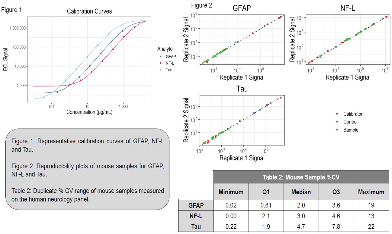 The MSD S-PLEX Neurology Panel 1 kit uses ultrasensitive electrochemiluminescence immunoassay technology to measure GFAP, NF-L, and Tau simultaneously in a 96-well plate format with standard liquid handling techniques. Serum and plasma samples from healthy mice and rats (n=5 each) were tested up to a 5-fold dilution, and brain lysates were tested from 0.032-4 μg/mL of total brain protein. Common commercially sourced mouse models of Alzheimer’s disease, amyotrophic lateral sclerosis, and Parkinson’s disease were tested to determine detectability of GFAP, NF-L, and Tau.