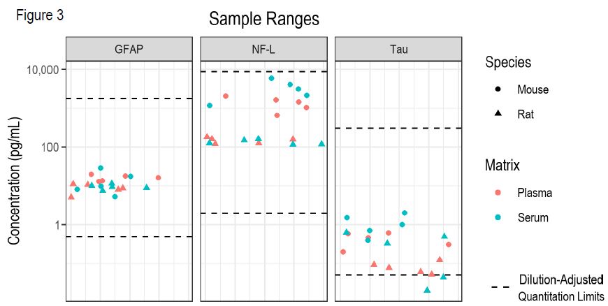 Normal BALB/C mouse and normal Sprague Dawley rat serum and plasma (n=5 each) samples were all detectable in the human GFAP and NF-L assays, and all but two samples were within the limits of quantitation in the human Tau assay (Figure 3).