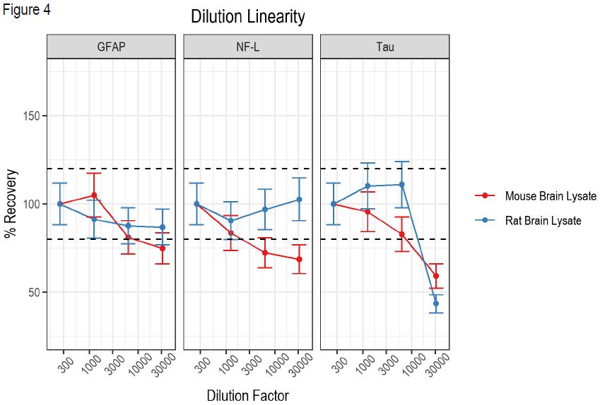 Normal mouse and rat serum and plasma were tested at 2-fold and 5-fold dilutions (data not shown). All analytes were detectable and diluted linearly in mouse serum and plasma and in rat serum. GFAP and NF-L were detectable and diluted linearly in rat plasma, while Tau was only detectable in rat plasma at 2-fold dilution. The recommended dilution for mouse and rat serum and plasma is 2-fold, aligning with the human serum and plasma recommendation for this assay.