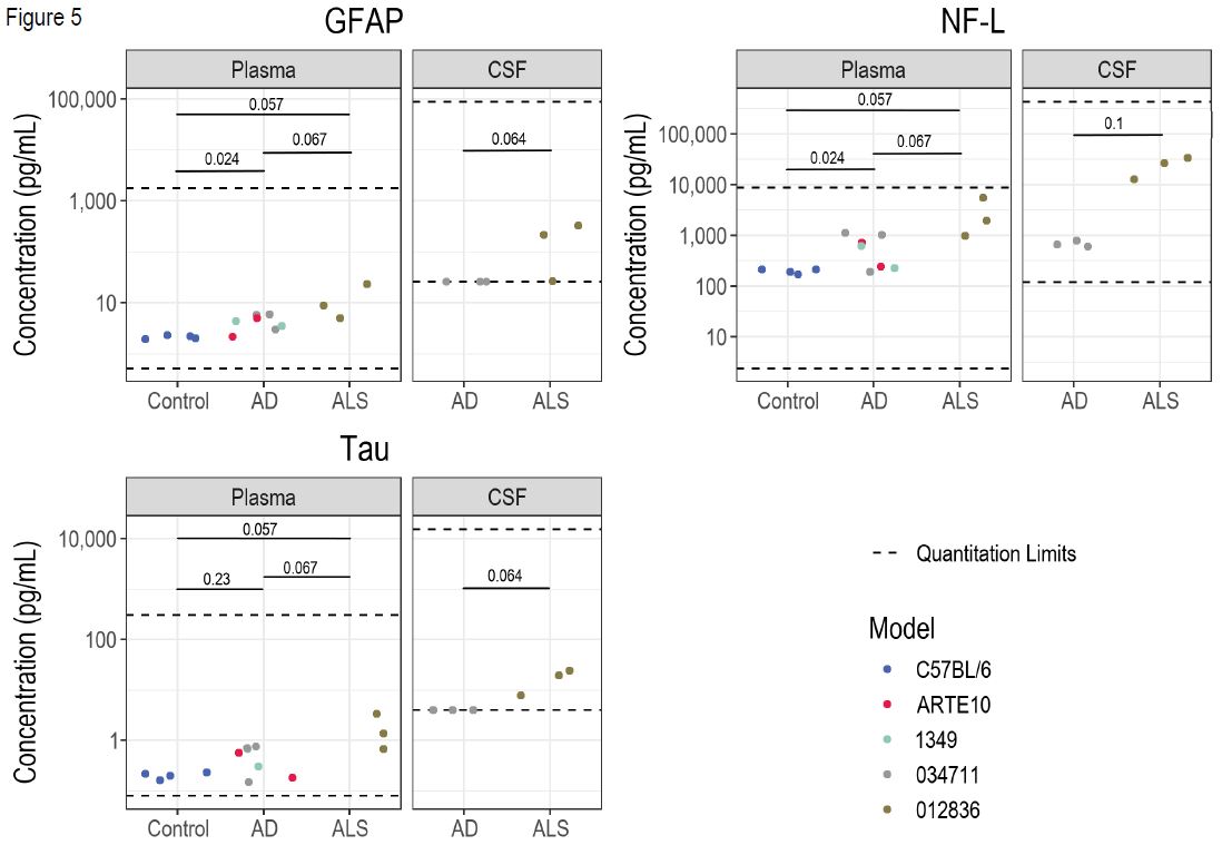 Plasma from four different mouse models of Alzheimer’s disease (AD) and one model of amyotrophic lateral sclerosis (ALS) were tested alongside C57BL/6 (control) commercially sourced mouse plasma at the recommended 2-fold dilution. Cerebrospinal fluid (CSF) samples matched from one model of AD and the model of ALS were tested at 100-fold dilution only due to limited sample availability. The biomarkers in all plasma samples were within the quantifiable range. The AD CSF samples were thresholded to assay limits of quantitation for GFAP and Tau, but detectable for NF-L. The ALS CSF samples showed elevated levels of all three analytes compared to levels in the AD model, though none showed significance due to high variability and the small number of samples that were tested. All plasma analytes trended higher in all ND models compared to normal mice, and measurements in the ALS model were further elevated above the AD model. AD plasma levels were significantly higher for GFAP and NF-L compared to controls.