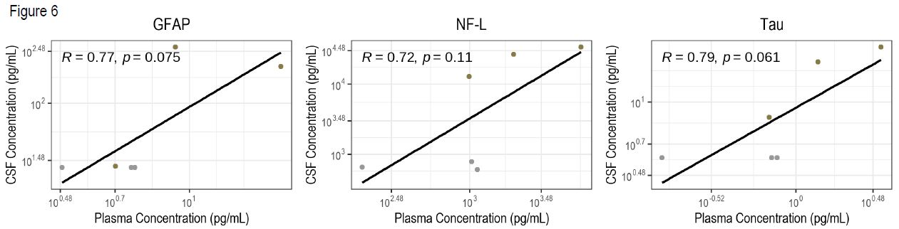 Figure 6: Matched plasma and CSF from ND mouse models correlated between 0.72-0.79 Pearson’s coefficient across all three analytes.